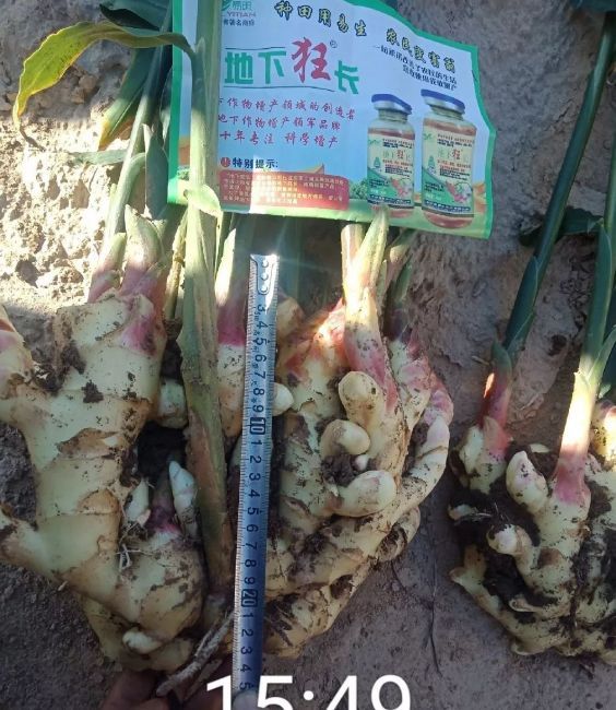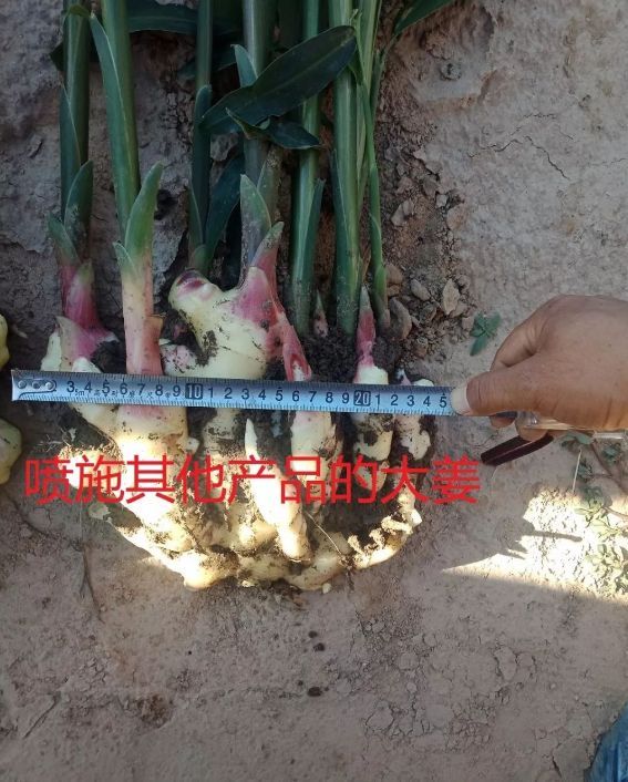 我們的市場人員現(xiàn)場挖姜,將噴施地下狂長的大姜與噴施其他產(chǎn)品的大姜現(xiàn)場測量對比,噴施過地下狂長的大姜姜指頭粗胖、連接點(diǎn)粗,不易破盤,姜盤齊整,并且比噴施其他產(chǎn)品的大姜長10cm,高5cm,對比非常明顯。