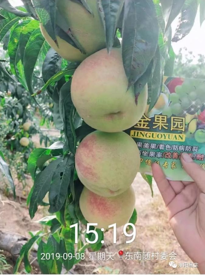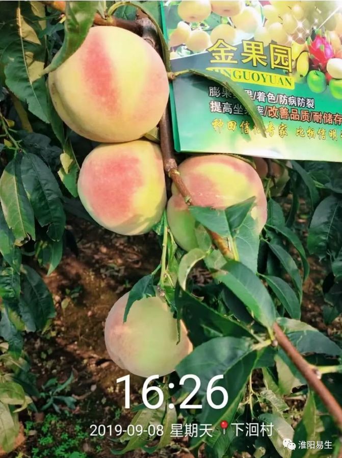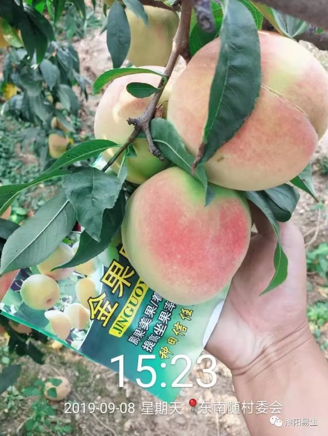 2019年易生科技售后服務(wù)組來到山東平度市店子鎮(zhèn)進(jìn)行噴施金果園的效果回訪,可以看到噴施過金果園的毛桃個(gè)頭大且均勻,顏色鮮亮,上色均勻,每個(gè)毛桃直徑都在80-90mm以上。未噴施金果園的毛桃個(gè)頭小,且果皮表面有一層灰白色的物質(zhì),霧蒙蒙的感覺不鮮亮。